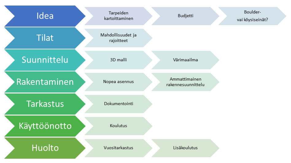 Kiipeilyseinän hankinta Easy Accessilta on helppoa ja yksinkertaista. Yrityksemme toteuttaa prosessin joka vaiheen, suunnittelusta ja rakentamisesta aina lopputarkastukseen saakka. Kaikki seinämme ovat yksilöllisesti suunniteltuja ja toteutettuja vastaamaan juuri sinun tarpeitasi. Toteutamme ideasi ammattitaidolla ja tarkkuudella, oli kyseessä kahden neliön lastenseinä tai 2000 neliön kiipeilykeskus. Jokaisen projektimme lähtökohtana on kokonaisvaltainen suunnittelu - emme rakenna sinulle vain kiipeilyseinää, vaan toteutamme ainutlaatuisen ja turvallisen ympäristön harrastaa kiipeilyä. Teemme jokaisesta kiipeilyseinästä kattavan 3D-mallin, joten näet jo suunnitteluvaiheessa kuinka seinä sopii tilaasi. Suurimman osan seinistä valmistamme Suomessa itse, isoimmat projektit toteutamme yhteistyössä Walltechin kanssa. Usein kysyttyihin kysymyksiin löydät vastauksen täältä.